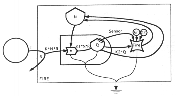 Variables:G1, G2 = amount of biomass where fire switches on/offTN (total nutrients) = N (nutrients in the soil) + F*Q (nutrients bound in the grass) Q = biomass K... = interaction coefficients Equations:N = TN - F*QR = I/(1 + K*N) DQ = K1*N*R - K2*Q, IF Q>G1 THEN Q=G2 Simulation:The graph shows the changes of N (blue) and Q (green) over a time period. The red lines show the fire.Source code: Fire.java |